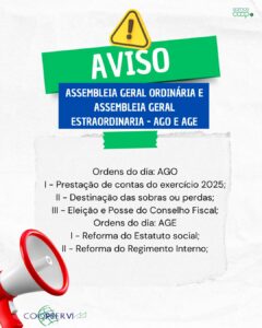 A COOPSERVI – COOPERATIVA DE TRABALHO DOS PRESTADORES DE SERVIÇO DO ESTADO BAHIA, inscrita no CNPJ Nº 29.366.294/0001-51, a intermédio de seu Presidente Arilson Figueredo da Silva, no uso das atribuições e na forma do Estatuto Social, salientando a expedição de circular para os demais postos desta Cooperativa e aos cooperados, convoca os(as) senhores(as) cooperados(as) para se reunirem em ASSEMBLEIA GERAL ORDINÁRIA E EXTRAORDINÁRIA SEMIPRESENCIAL, que se realizará na sede desta Cooperativa situada na Rua Presidente Café Filho, nº 555 – 1 A, Bairro SIM, Feira de Santana – BA, CEP 44.085-470, que, conforme art. 31, alínea A do Estatuto, justificando-se: