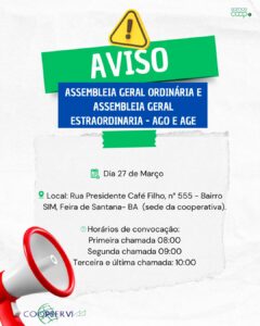 Assim, a realização da ASSEMBLEIA GERAL ORDINÁRIA E EXTRAORDINÁRIA SEMIPRESENCIAL será feita na Rua Presidente Café Filho, nº 555 – 1 A, Bairro SIM, Feira de Santana – BA, CEP 44.085-470, no dia 27 de março de 2026, às 08:00, em primeira convocação com a presença de 2/3 dos cooperados e/ou votantes, em segunda convocação às 09:00 horas, no mesmo dia e local, com a presença de metade mais um do número total de cooperados e/ou votantes, e persistindo a falta de quórum legal, em terceira e última convocação, às 10:00 horas, com a presença mínima de 50 (cinquenta) cooperados ou 20% do total de cooperados e/ou votantes, o que for menor, a fim de deliberarem sobre a seguinte ORDEM DO DIA: